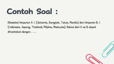 Contoh Soal : Diketahui himpunan A = {Jakarta, Bangkok, Tokyo, Manila} dan himpunan B = {Indonesia, Jepang, Thailand, Filipina, Malaysia}. Relasi dari A ke B dapat dinyatakan dengan . . . .