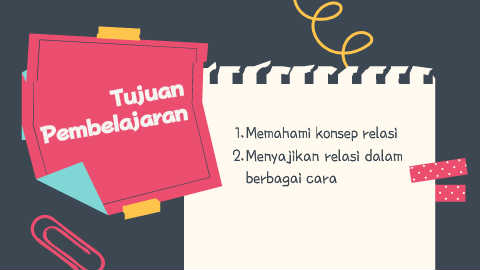 Tujuan Pembelajaran 1.Memahami konsep relasi 2.Menyajikan relasi dalam berbagai cara