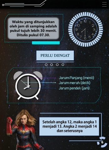 Waktu yang ditunjukkan oleh jam di samping adalah pukul tujuh lebih 30 menit. Ditulis pukul 07.30. PERLU DIINGAT Jarum Panjang (menit) Jarum merah (detik) Jarum pendek (jam) 6
