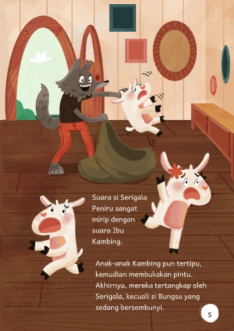 Suara si Serigala Peniru sangat mirip dengan suara Ibu Kambing. Anak-anak Kambing pun tertipu, kemudian membukakan pintu. Akhirnya, mereka tertangkap oleh Serigala, kecuali si Bungsu yang sedang bersembunyi. 4 5