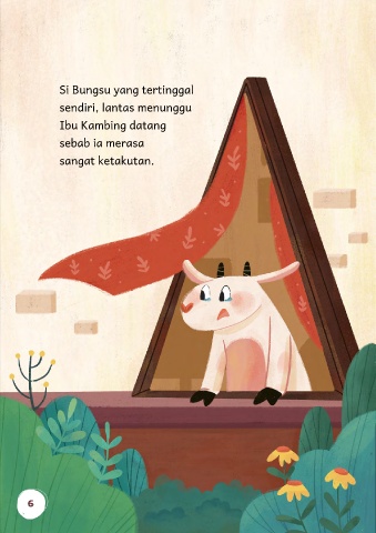 Si Bungsu yang tertinggal sendiri, lantas menunggu Ibu Kambing datang sebab ia merasa sangat ketakutan. 6 6