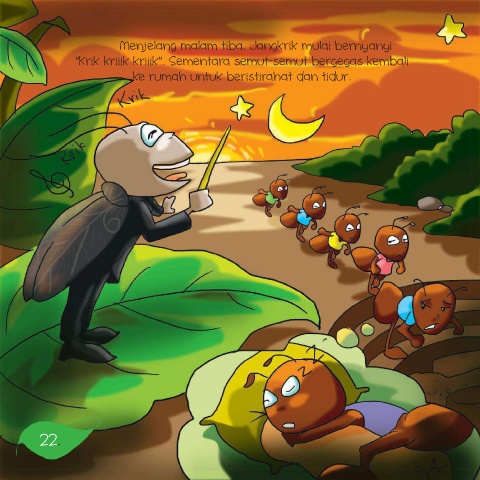 Menjelang malam tiba. Jangkrik mulai bernyanyi "Krik kriiik kriiik". Sementara semut-semut bergegas kembali ke rumah untuk beristirahat dan tidur. 22.