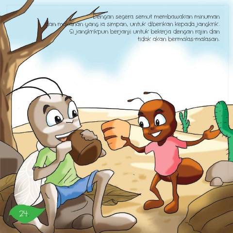 Dengan segera semut membawakan minuman dan makanan yang ia simpan, untuk diberikan kepada jangkrik. Si jangkrikpun berjanji untuk bekerja dengan rajin dan tidak akan bermalas-malasan. 24.