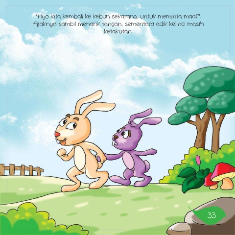 "Ayo kita kembali ke kebun sekarang, untuk meminta maaf". Ajaknya sambil menarik tangan, sementara adik kelinci masih ketakutan. 33