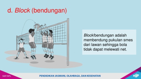 d. Block (bendungan) Block/bendungan adalah membendung pukulan smes dari lawan sehingga bola tidak dapat melewati net.