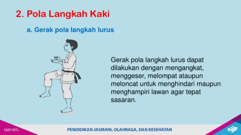 2. Pola Langkah Kaki a. Gerak pola langkah lurus Gerak pola langkah lurus dapat dilakukan dengan mengangkat, menggeser, melompat ataupun meloncat untuk menghindari maupun menghampiri lawan agar tepat sasaran.