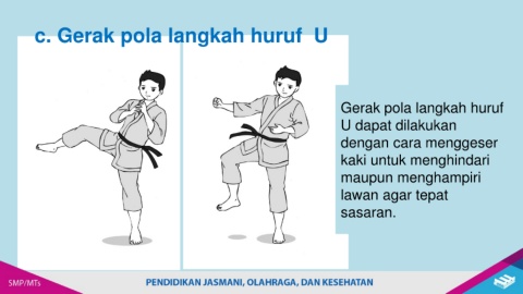 c. Gerak pola langkah huruf U Gerak pola langkah huruf U dapat dilakukan dengan cara menggeser kaki untuk menghindari maupun menghampiri lawan agar tepat sasaran.
