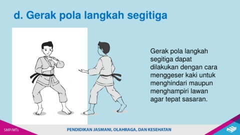 d. Gerak pola langkah segitiga Gerak pola langkah segitiga dapat dilakukan dengan cara menggeser kaki untuk menghindari maupun menghampiri lawan agar tepat sasaran.