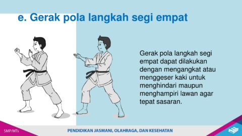 e. Gerak pola langkah segi empat Gerak pola langkah segi empat dapat dilakukan dengan mengangkat atau menggeser kaki untuk menghindari maupun menghampiri lawan agar tepat sasaran.