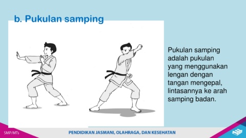 b. Pukulan samping Pukulan samping adalah pukulan yang menggunakan lengan dengan tangan mengepal, lintasannya ke arah samping badan.