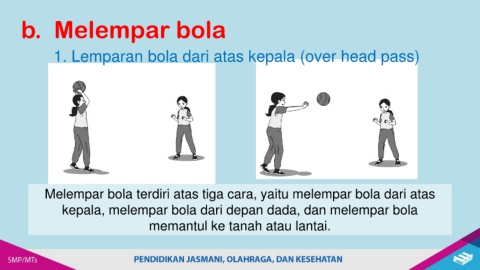 b. Melempar bola 1. Lemparan bola dari atas kepala (over head pass) Melempar bola terdiri atas tiga cara, yaitu melempar bola dari atas kepala, melempar bola dari depan dada, dan melempar bola memantul ke tanah atau lantai.