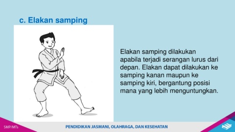 c. Elakan samping Elakan samping dilakukan apabila terjadi serangan lurus dari depan. Elakan dapat dilakukan ke samping kanan maupun ke samping kiri, bergantung posisi mana yang lebih menguntungkan.