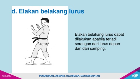 d. Elakan belakang lurus Elakan belakang lurus dapat dilakukan apabila terjadi serangan dari lurus depan dan dari samping.