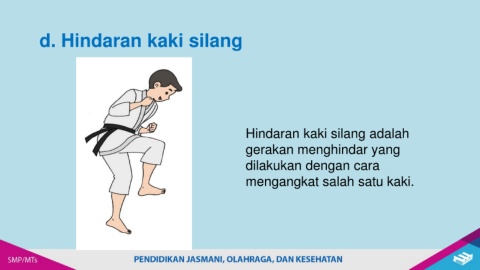 d. Hindaran kaki silang Hindaran kaki silang adalah gerakan menghindar yang dilakukan dengan cara mengangkat salah satu kaki.