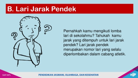 B. Lari Jarak Pendek Pernahkah kamu mengikuti lomba lari di sekolahmu? Tahukah kamu jarak yang ditempuh untuk lari jarak pendek? Lari jarak pendek merupakan nomor lari yang selalu diperlombakan dalam cabang atletik.