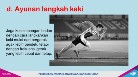 d. Ayunan langkah kaki Jaga keseimbangan badan dengan cara langkahkan kaki mulai dari bergerak agak lebih pendek, tetapi dengan frekuensi gerak yang lebih cepat dan tetap.