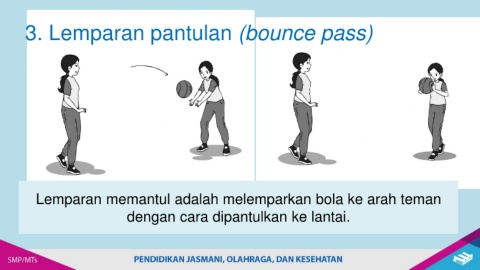 3. Lemparan pantulan (bounce pass) Lemparan memantul adalah melemparkan bola ke arah teman dengan cara dipantulkan ke lantai.