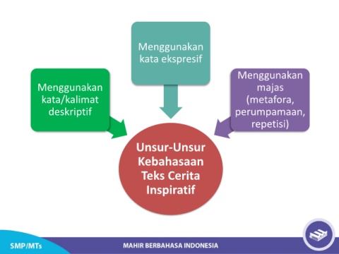 Menggunakan kata ekspresif Menggunakan Menggunakan majas kata/kalimat (metafora, deskriptif perumpamaan, repetisi) Unsur-Unsur Kebahasaan Teks Cerita Inspiratif