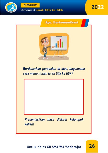 Ayo, Berkomunikasi Berdasarkan persoalan di atas, bagaimana cara menentukan jarak titik ke titik? Presentasikan hasil diskusi kelompok kalian! 26