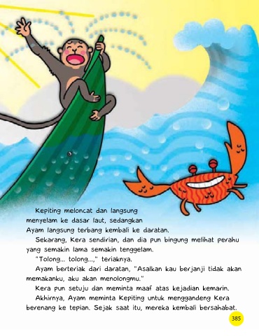 Akhirnya, Ayam meminta Kepiting untuk menggandeng Kera