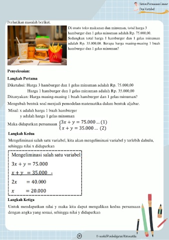 Diketahui: Harga 3 hamburger dan 1 gelas minuman adalah Rp. 75.000,00