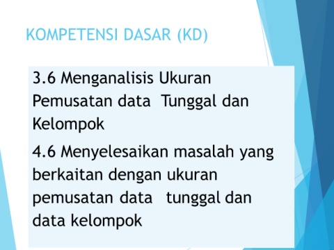 KOMPETENSI DASAR (KD) 3.6 Menganalisis Ukuran Pemusatan data Tunggal dan Kelompok 4.6 Menyelesaikan masalah yang berkaitan dengan ukuran pemusatan data tunggal dan data kelompok