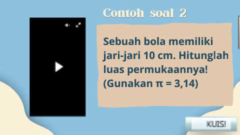 Contoh soal 2 Sebuah bola memiliki jari-jari 10 cm. Hitunglah luas permukaannya! (Gunakan π = 3,14)