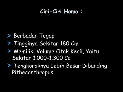 Ciri-Ciri Homo : Berbadan Tegap Tingginya Sekitar 180 Cm Memiliki Volume Otak Kecil, Yaitu Sekitar 1.000-1.300 Cc Tengkoraknya Lebih Besar Dibanding Pithecanthropus