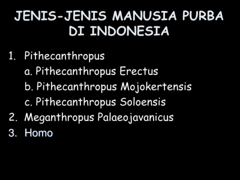 JENIS-JENIS MANUSIA PURBA DI INDONESIA 1. Pithecanthropus a. Pithecanthropus Erectus b. Pithecanthropus Mojokertensis c. Pithecanthropus Soloensis 2. Meganthropus Palaeojavanicus 3. Homo