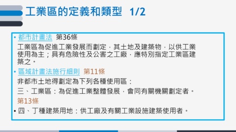 工業區的定義和類型 1/2 • 都市計畫法 第36條 工業區為促進工業發展而劃定,其土地及建築物,以供工業 使用為主;具有危險性及公害之工廠,應特別指定工業區建 築之。 • 區域計畫法施行細則 第11條 非都市土地得劃定為下列各種使用區: 三、工業區:為促進工業整體發展,會同有關機關劃定者。 第13條 • 四、丁種建築用地:供工廠及有關工業設施建築使用者。
