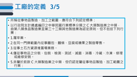 • 5.非屬於前款 C 大類製造業之中類,但仍認定屬從事物品製造、加工範圍之