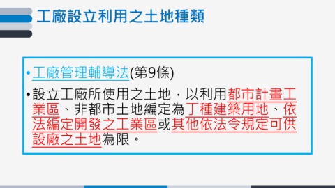工廠設立利用之土地種類 •工廠管理輔導法(第9條) •設立工廠所使用之土地,以利用都市計畫工 業區、非都市土地編定為丁種建築用地、依 法編定開發之工業區或其他依法令規定可供 設廠之土地為限。
