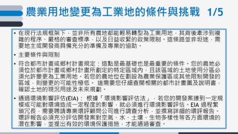 • 在現行法規框架下,並非所有農地都能輕易轉型為工業用地,其背後牽涉到複