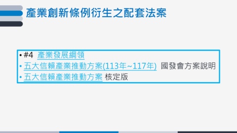 產業創新條例衍生之配套法案 • #4 產業發展綱領 • 五大信賴產業推動方案(113年~117年) 國發會方案說明 • 五大信賴產業推動方案 核定版