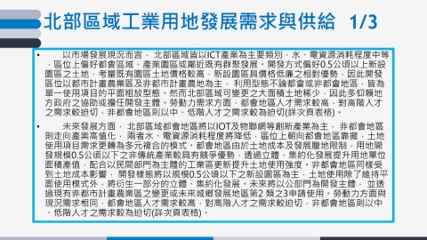 • 未來發展方面, 北部區域都會地區將以IOT及物聯網等創新產業為主, 非都會地區
