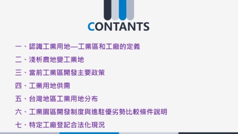 CONTANTS 一、認識工業用地—工業區和工廠的定義 二、淺析農地變工業地 三、當前工業區開發主要政策 四、工業用地供需 五、台灣地區工業用地分布 六、工業園區開發制度與進駐優劣勢比較條件說明 七、特定工廠登記合法化現況