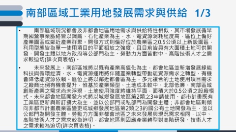 • 未來發展上,南部區域將以既有產業高值化為主,都會地區並新增發展綠能