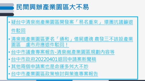 民間興辦產業園區大不易 • 疑台中清泉崗產業園區開發案「易名重來」 環團抗議籲退 件駁回 • 清泉崗產業園區更名「通和」借屍還魂 農發三不該設產業 園區 盧市府應退件駁回! • 台中市議會專案報告-清泉崗產業園區規劃內容等 • 台中市政府20220401退回申請案新聞稿 • 其他兩個申請案也是命運多舛大不妙 • 台中市產業園區政策檢討與策進專案報告