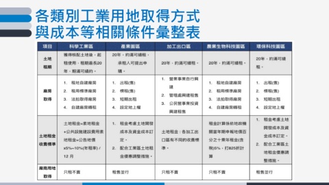 各類別工業用地取得方式 與成本等相關條件彙整表