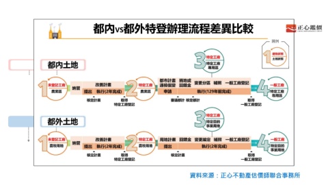 都內VS都外特登辦理流程差異比較 圖例 都內土地 都外土地 資料來源:正心不動產估價師聯合事務所