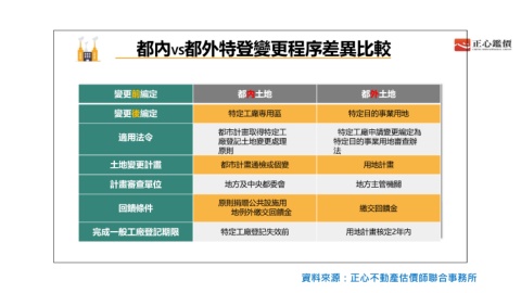 都內VS都外特登變更程序差異比較 變更前編定 都內土地 都外土地 變更後編定 特定工廠專用區 特定目的事業用地 都市計畫取得特定工 特定工廠申請變更編定為 適用法令 廠登記土地變更處理 特定目的事業用地審查辦 原則 法 土地變更計畫 都市計畫通檢或個變 用地計畫 計畫審查單位 地方及中央都委會 地方主管機關 原則捐贈公共設施用 回饋條件 地例外繳交回饋金 繳交回饋金 完成一般工廠登記期限 特定工廠登記失效前 用地計畫核定2年內 資料來源:正心不動產估價師聯合事務所