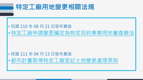 特定工廠用地變更相關法規 • 民國 110 年 06 月 21 日發布實施 •特定工廠申請變更編定為特定目的事業用地審查辦法 • 民國 111 年 04 月 13 日發布實施 •都市計畫取得特定工廠登記土地變更處理原則