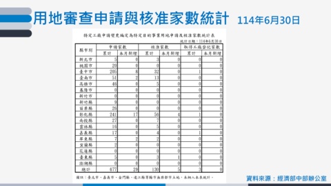 用地審查申請與核准家數統計 114年6月30日 資料來源:經濟部中部辦公室