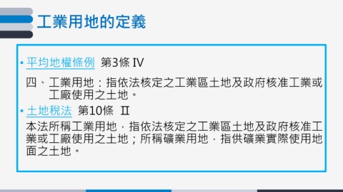 工業用地的定義 • 平均地權條例 第3條 Ⅳ 四、工業用地:指依法核定之工業區土地及政府核准工業或 工廠使用之土地。 • 土地稅法 第10條 Ⅱ 本法所稱工業用地,指依法核定之工業區土地及政府核准工 業或工廠使用之土地;所稱礦業用地,指供礦業實際使用地 面之土地。