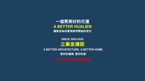 一個更美好的花蓮 A BETTER HUALIEN 讓家成為你實現夢想開始的地方 SINCE 2005-2025 立業金建設 A BETTER ARCHITECTURE. A BETTER HOME 更好的建築.更好的家 創造一個令人難忘的品牌標語