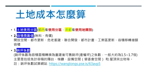 土地成本怎麼算 • 1.土地使用分區(都內看使用分區,非都看使用地類別) • 2.容積獎勵值(無料、有償) 開放空間、都市更新、危老重建、聯合開發、都市計畫、工業區更新、容積移轉增額 容積 • 3.銷坪係數 (銷坪係數為容積面積轉換為重建後可售銷坪(產權坪)之係數,一般大約為1.5~1.7倍) 主要是包括免計容積的陽台、梯廳、設備空間(管委會空間) 和 屋頂突出物等。 註:銷坪係數試算網站 https://wanglongs.pse.is/63avp5