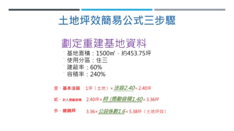 土地坪效簡易公式三步驟 劃定重建基地資料 ˙基地面積:1500㎡,約453.75坪 ˙使用分區:住三 ˙建蔽率:60% ˙容積率:240% 壹、基本法容 1坪〈土地〉×法 容 2.40=2.40坪 貳、計入獎勵容積 2.40坪×時 {獎勵容積1.40=3.36坪 参、總銷坪 3.36×公設係數1.6=5.38坪〈土地坪效〉