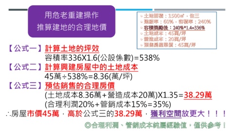 ∴房屋市價45萬,高於公式三的38.29萬,獲利空間放更大!!!