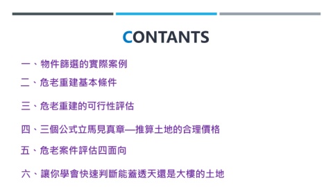 CONTANTS 一、物件篩選的實際案例 二、危老重建基本條件 三、危老重建的可行性評估 四、三個公式立馬見真章—推算土地的合理價格 五、危老案件評估四面向 六、讓你學會快速判斷能蓋透天還是大樓的土地