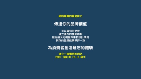 網路銷售的經營能力 傳達你的品牌價值 可以與你的受眾 建立強烈的情感聯繫 結合強大的視覺效果和設計項目 與你的品牌故事保持一致 為消費者創造難忘的體驗 建立一個獨特的網站 找到一個好的 FB.IG 寫手